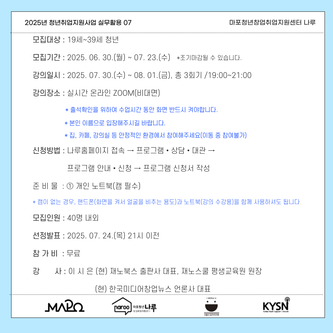 ✔ 강의일시 : 2025.07.30.(수)~2025.08.01.(금) 19:00~21:00