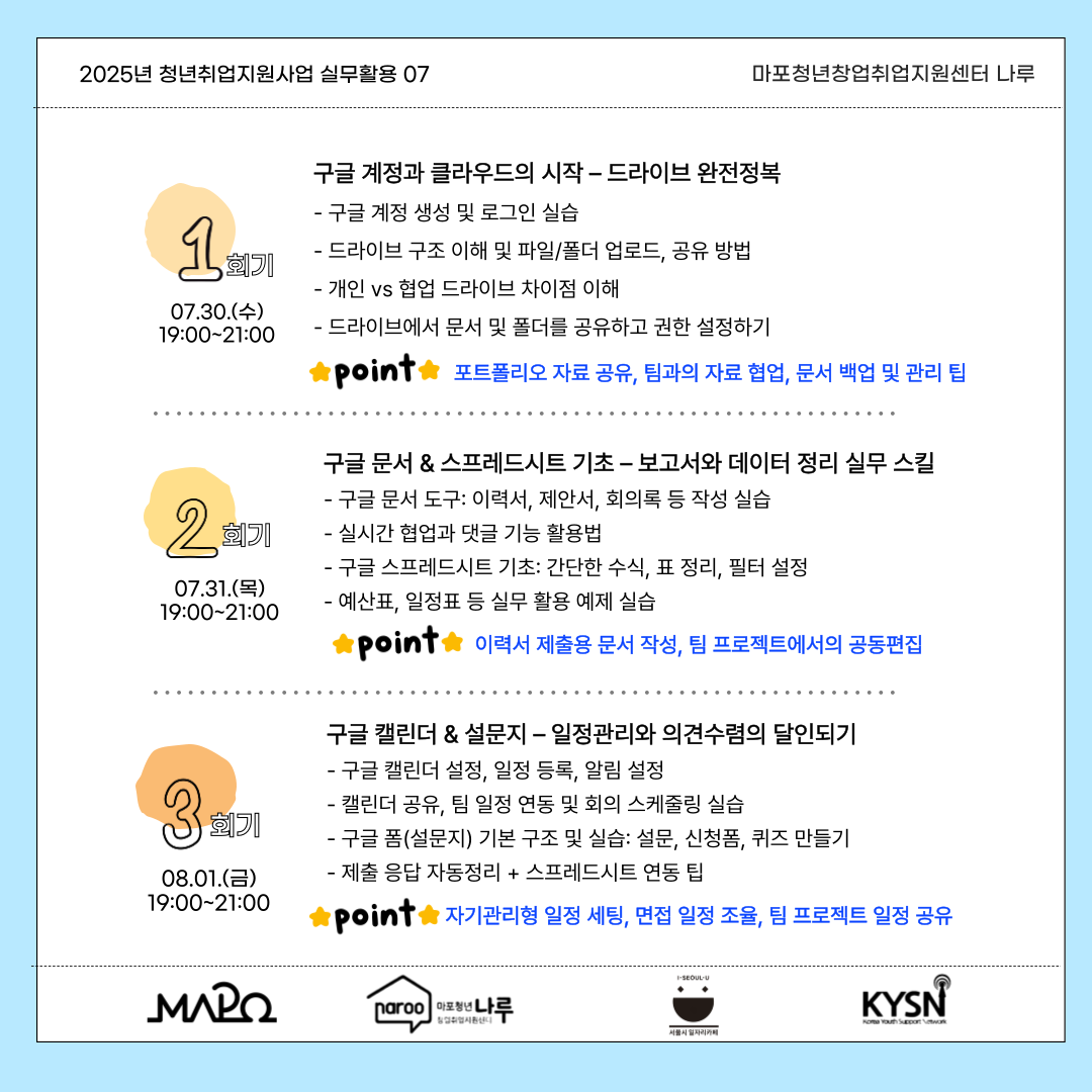 ☑ 생산성도구(Google Drive, Docs, Sheets, Calendar, Forms 등)실습 중심으로 익히고 싶은 청년