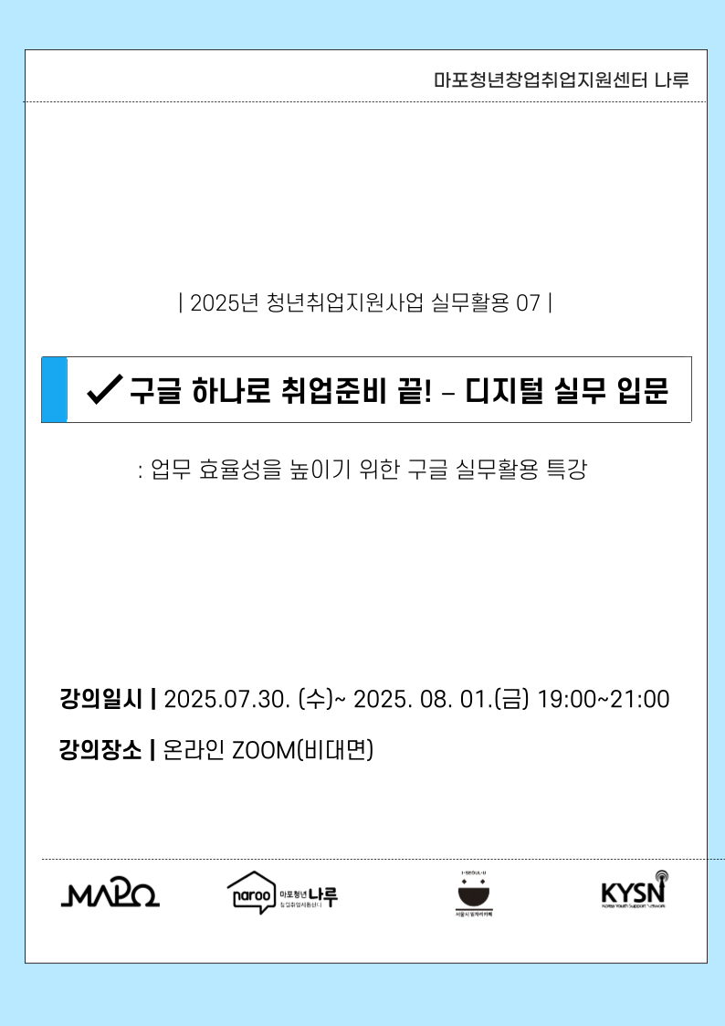 안녕하세요, 마포청년창업취업지원센터 나루입니다!회사 또는 일상에서 제일 중요한 문서, 캘린더, 문서 백업 등 구글웍스 전문 강사와 함께구글 워크스페이스의 다양한 기능에 대해 배워봐요!