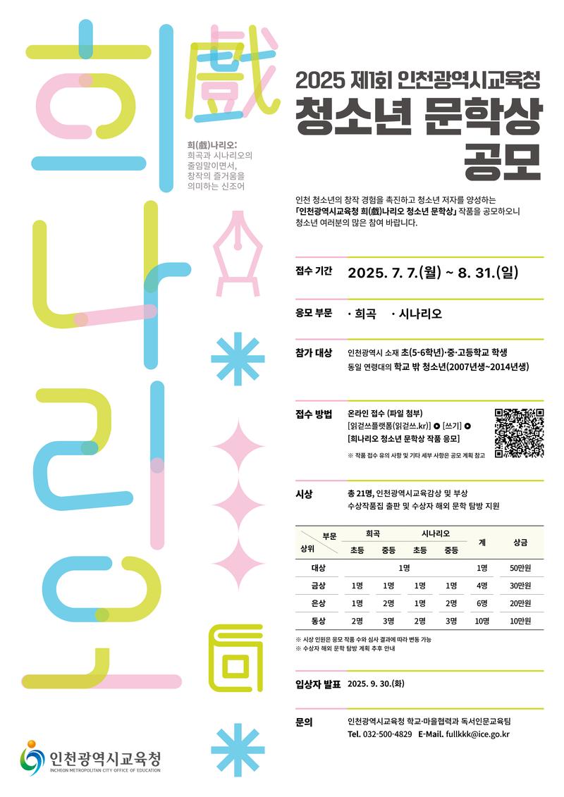 ★[공지] 2025 제1회 인천광역시교육청 희나리오 청소년 문학상 공모 안내
