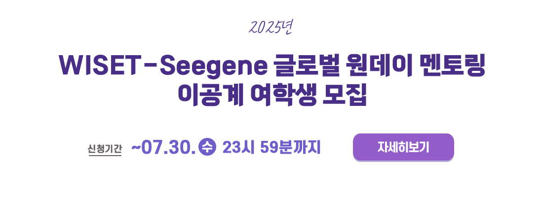 ▶ W브릿지 > 네트워크 > 글로벌 멘토링 > 멘토링 목록 내 「2025년 WISET-Seegene 글로벌 멘토링」 신청