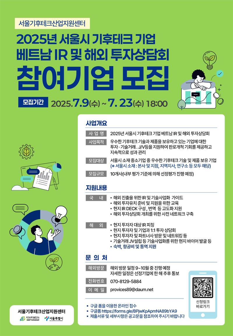 1. 사업개요 ○ (사업명) 2025년 서울시 기후테크 기업을 위한 IR 컨설팅 및 해외 투자상담회 ○ (사업기간) 2025. 7. ~ 2025. 11. ○ (사업내용) 우수한 기후테크 기술/제품 보유 기업에 대한 투자 및 수출을 지원하여 판로개척 기회를 제공하고 지속적으로 성과 관리 ○ (모집대상) 서울시 소재 기후테크* 기술 또는 제품을 보유하며, 해외 진출을 희망하는 중소기업 (업력 무관) 「기후기술법」‘기후변화대응 기술 세부내용 고시 38대 기술’ 에 해당하는 기술(공고문 부록 참조) ○ (지원규모) 10개사 ○ (지원방식) 교육 프로그램 참여, 해외 출장 시 통역 및 경비 지원 ○ (선정방법) - (서면심사) 지원자격 확인 및 제출서류 서면평가 ※ 사회적 기업, 여성기업, 장애인 기업, 청년 창업 기업, 고령자 친화 기업일 경우 예선 가점 부여 - (결과 발표) 각 단계별로 선정기업에 한 해 개별 연락