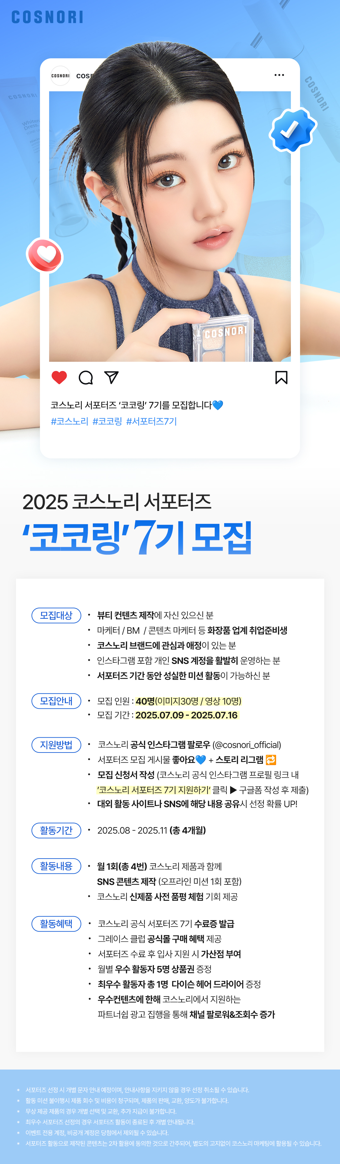 *서포터즈 활동으로 제작된 콘텐츠는 2차 활용에 동의한 것으로 간주되어, 별도의 고지없이 코스노리 마케팅에 활용될 수 있습니다.