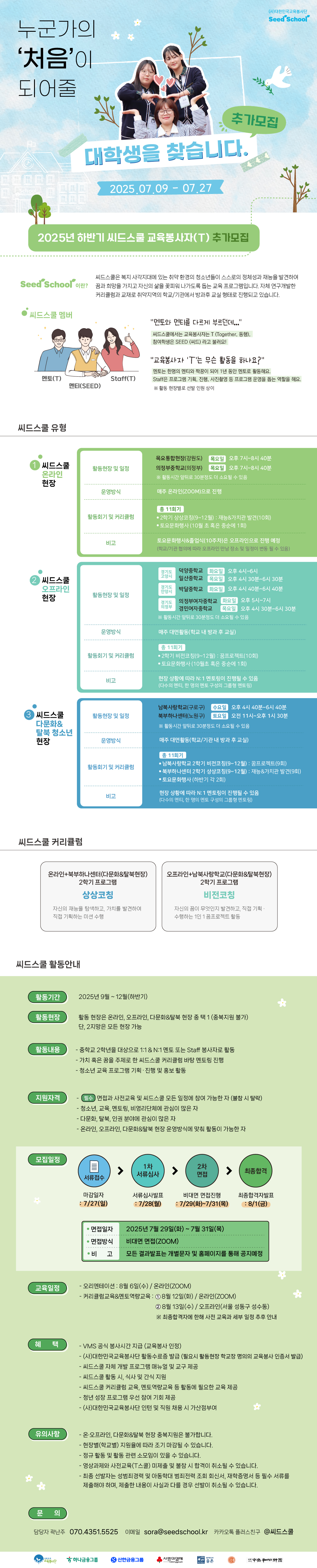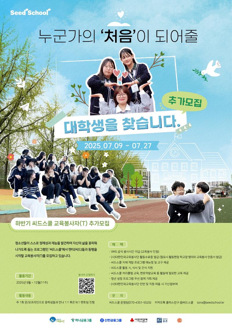 사단법인 대한민국교육봉사단 / 2025년 하반기 청소년 정서˙진로 멘토링 씨드스쿨 교육봉사자(T) 추가모집