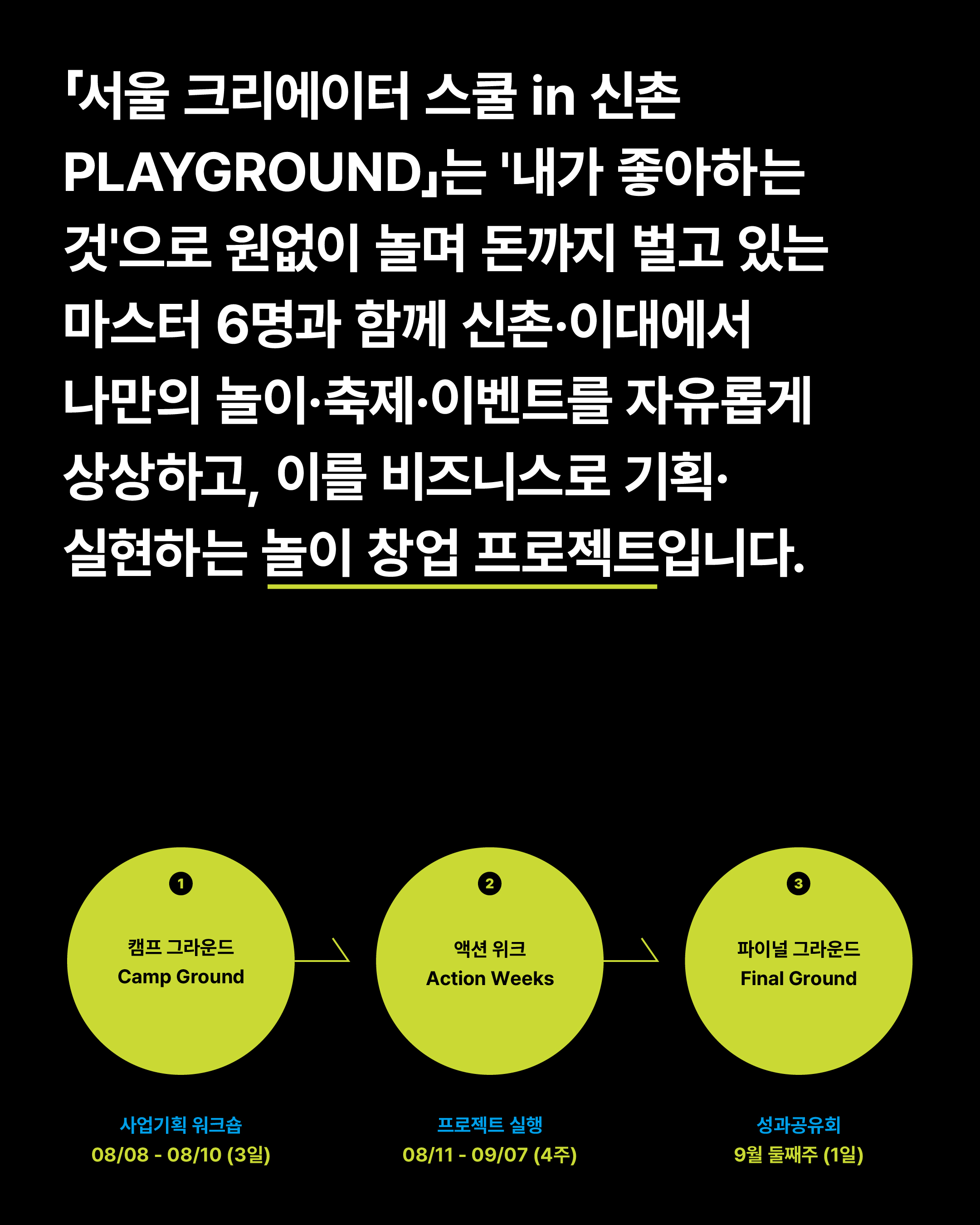 <서울 크리에이터 스쿨 in 신촌 - PLAYGROUND>는 '내가 좋아하는 것'으로 원없이 놀며 돈까지 벌고 있는 마스터 6명과 함께 신촌·이대에서 나만의 놀이·축제·이벤트를 자유롭게 상상하고, 이를 비즈니스로 기획·실현하는 놀이 창업 프로젝트입니다.