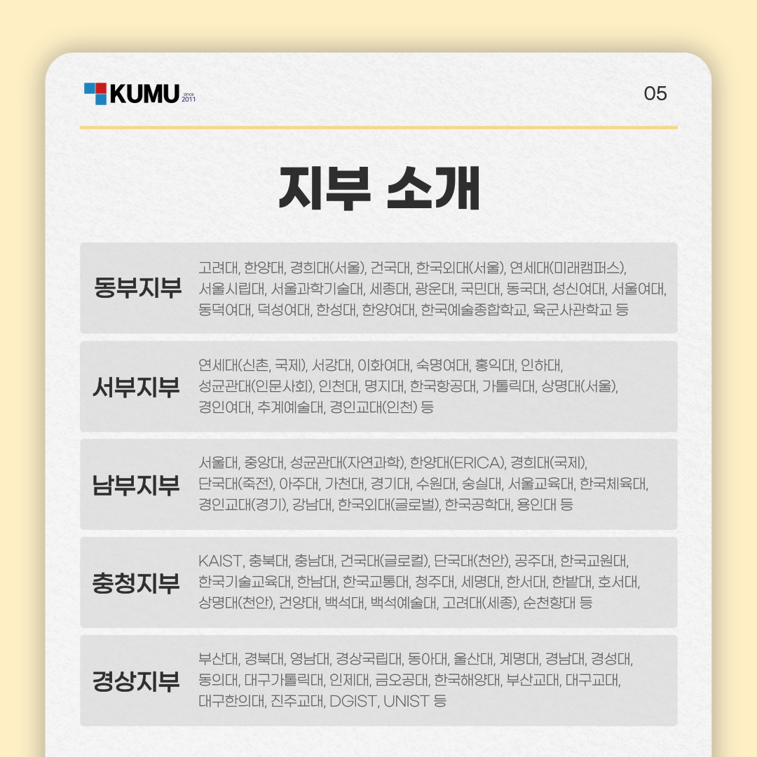 2010년, 중앙일보 <공부의 신 프로젝트> 우수 멘토들이 모여 출범한 ‘한국대학생멘토연합(KUMU)’은 '자기 발전, 상호 발전, 사회 발전'을 핵심 가치로 삼고 있는 전국 단위 교육기부 연합 동아리입니다.