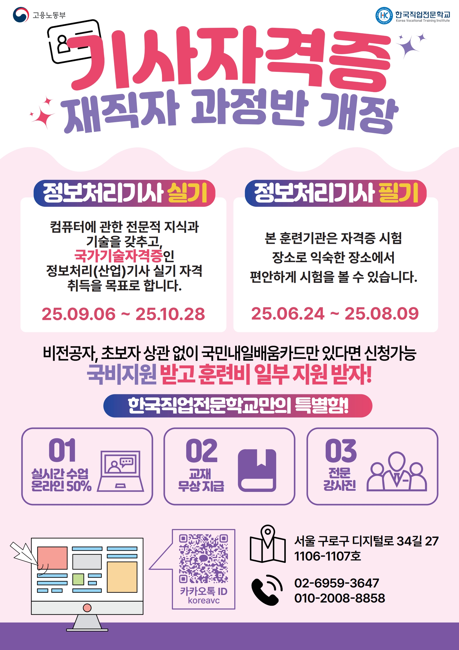 바쁜 여러분을 위해 50%의 주말 대면 교육은 서울 한국직업전문학교에서 진행합니다.