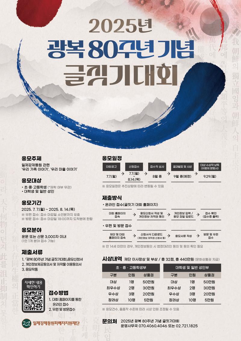 (재)일제강제동원피해자지원재단은 2025년 광복 80주년을 맞이하여 역사에 대한 올바른 정체성 확립과 평화 인식 함양에 기여하고자「광복 80주년 기념 글짓기 대회」를 개최하오니, 일제강제동원에 관심 있는 분들의 많은 관심과 참여 부탁드립니다.