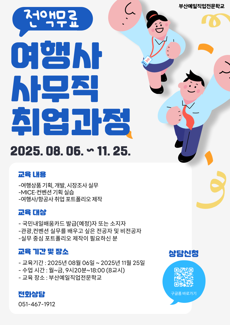 ★훈련수당 매월 70만원★ 여행사 취업, 이젠 실무로 준비하세요!