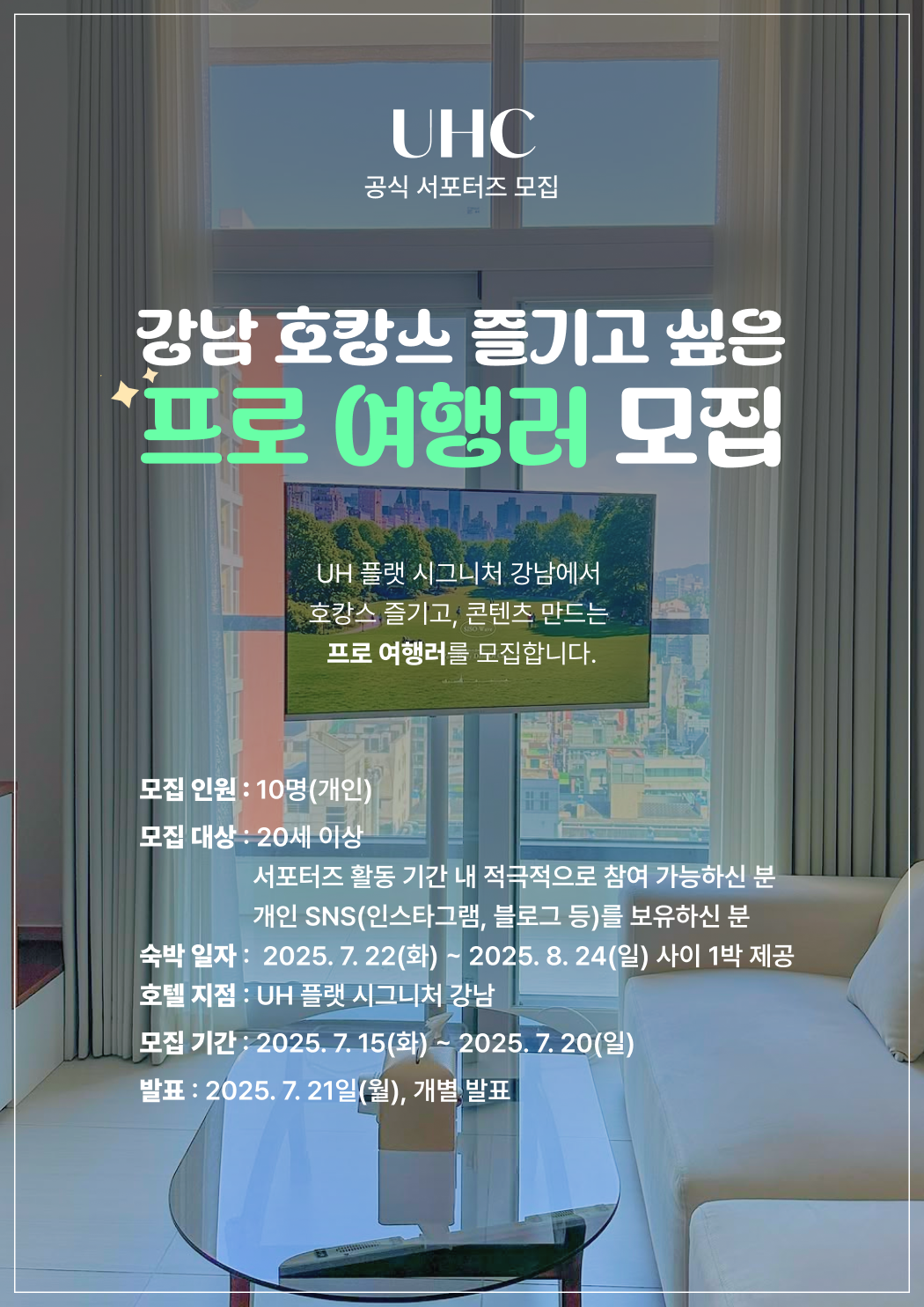 - UH 플랫 시그니처 강남 객실(랜덤) 1박 제공(평일만 가능)