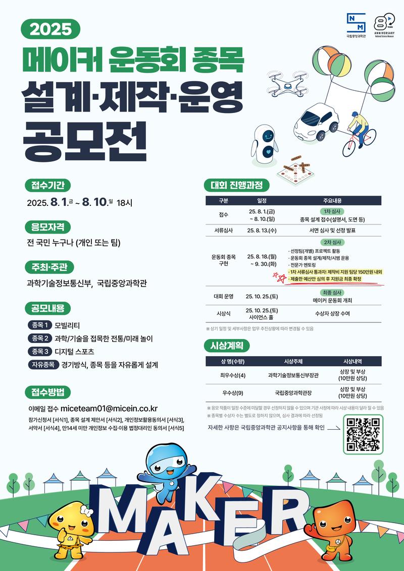 · 필요서류 파일첨부하여 이메일 제출 | · 개별 선정 통보 및 대회운영 집합교육/멘토링(8.18) 필수 참가 · 전문가 멘토링 참가(8.18~9.30) · 선정팀은 제작비 지원을 받아 경기운영에 필요한 결과물을 제작하여 지정일(9.30)까지 제출 | · 25.10.25. 메이커 운동회 운영 · 대회 운영 및 유지보수 활동 필수 참여 |
