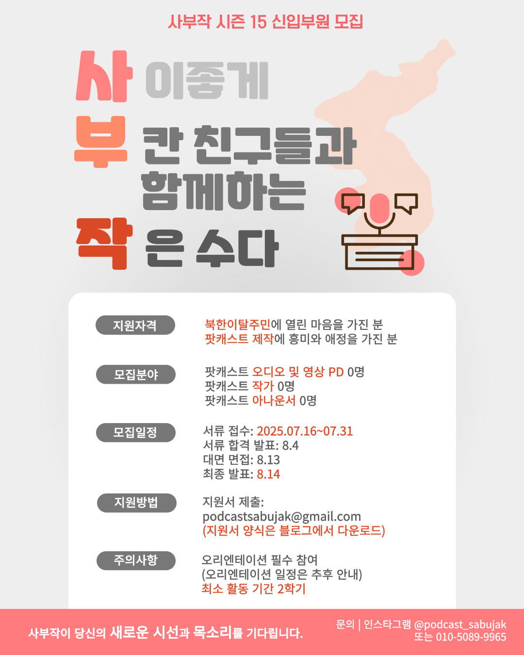 - 그간 사부작은 남북한 출신 MC가 함께 방송을 진행해 왔습니다. 최근 북한 출신 MC들의 활동 기간이 끝나 새로운 북한 출신 MC의 지원이 필요합니다. 북한이 고향인 분들의 많은 지원 부탁드립니다. 물론 남한 출신 지원자들도 환영합니다 :)