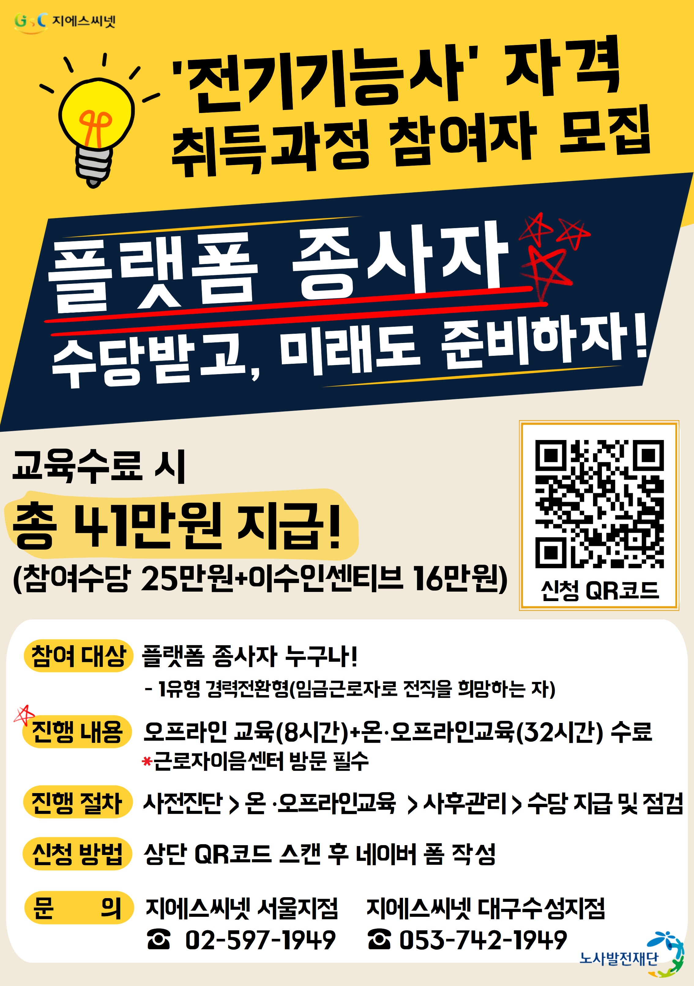 배달/대리운전 등 플랫폼 종사자, 프리랜서, 특수형태근로종사자를 위한 경력 설계 + 직무교육 + 취업지원 통합 서비스입니다.
