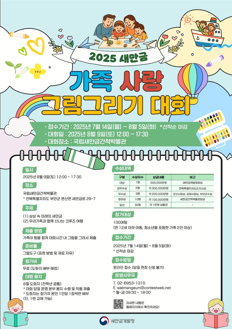특별상 | 30명 | 각 1만원 상품권 | - 사전접수 •참가대상 : 100여 팀(만 12세 이하 아동, 청소년을 포함한 가족 2인 이상) •접수기간 : 2025년 7월 14일(월) ~ 8월 5일(화) * 선착순 마감 •접수방법 : 온라인 접수(당일 현장 신청 불가) ■ 유의사항 •주최자는 입상작을 비영리·공익적 목적으로 복제 및 전송할 수 있고, 별도의 합의를 통해 2차적 저작물을 작성할 수 있습니다. •주최자는 입상작을 사전에 고지한 목적 범위 내에서 주최자가 관리하는 누리집 및 SNS에 게재할 수 있습니다. •국내 타 공모전 등에 출품되지 않은 순수 창작물이어야 하며, 표절·도용·모방 작품으로 판명될 경우 심사에서 제외되며,수상 이후라도 수상 취소와 상금을 회수할 수 있습니다. •수상자는 시상을 위해 주최기관이 요구하는 관련 서류를 제출하여야 하며, 기한 내에 제출하지 않을 경우 수상이 취소될 수 있습니다. •공모 내용 및 일정은 주최기관의 사정에 따라 변경 가능하며, 변경사항 및 안내사항은 공모전 접수사이트를 통해 수시로 공지되므로 불이익이 없도록 주의바랍니다. ■ 문의사항 •공모전 운영사무국(평일 09:30-18:00) •Tel : 02-6953-1310 •E-Mail : saemangeum@contestweb.net