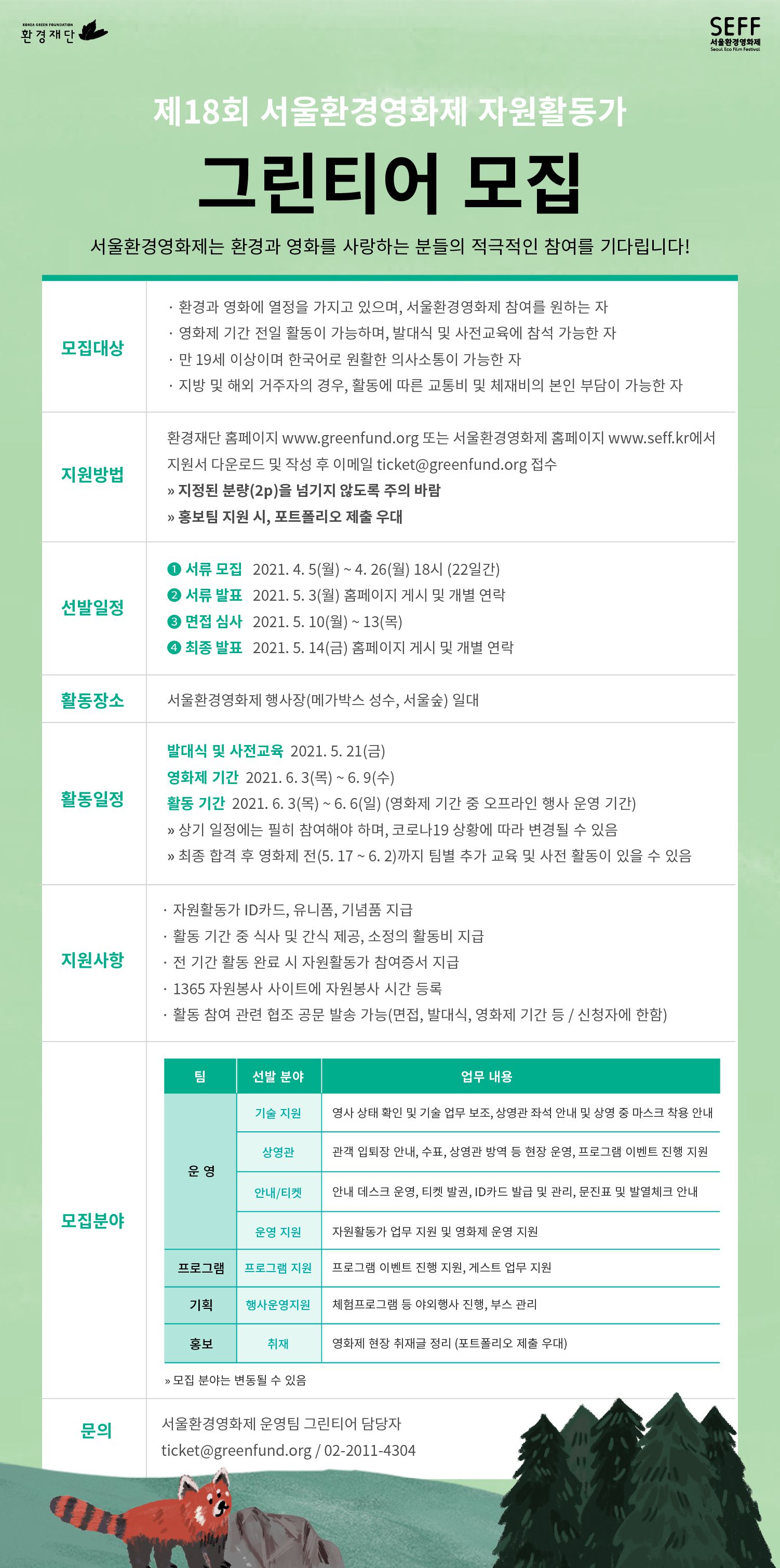 - 환경재단 홈페이지 www.greenfund.org / 서울환경영화제 홈페이지 www.seff.kr 지원서 다운로드 및 작성 후