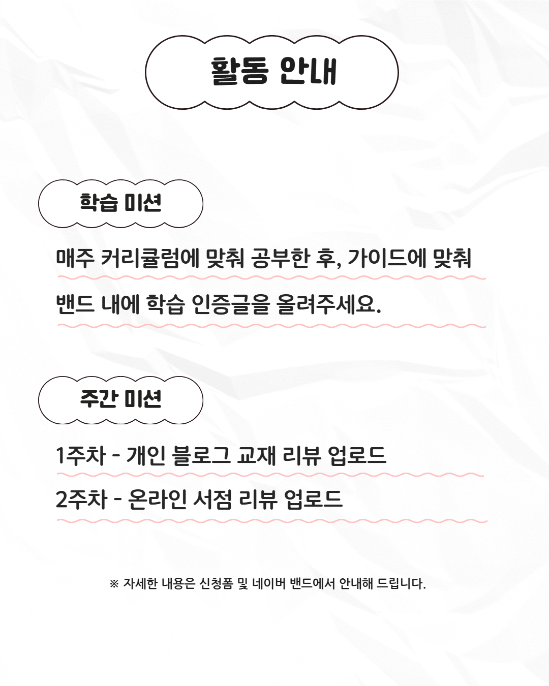 매주 커리큘럼에 맞춰 학습 후, 가이드에 맞춰 밴드 내 학습 인증 글을 올려주세요