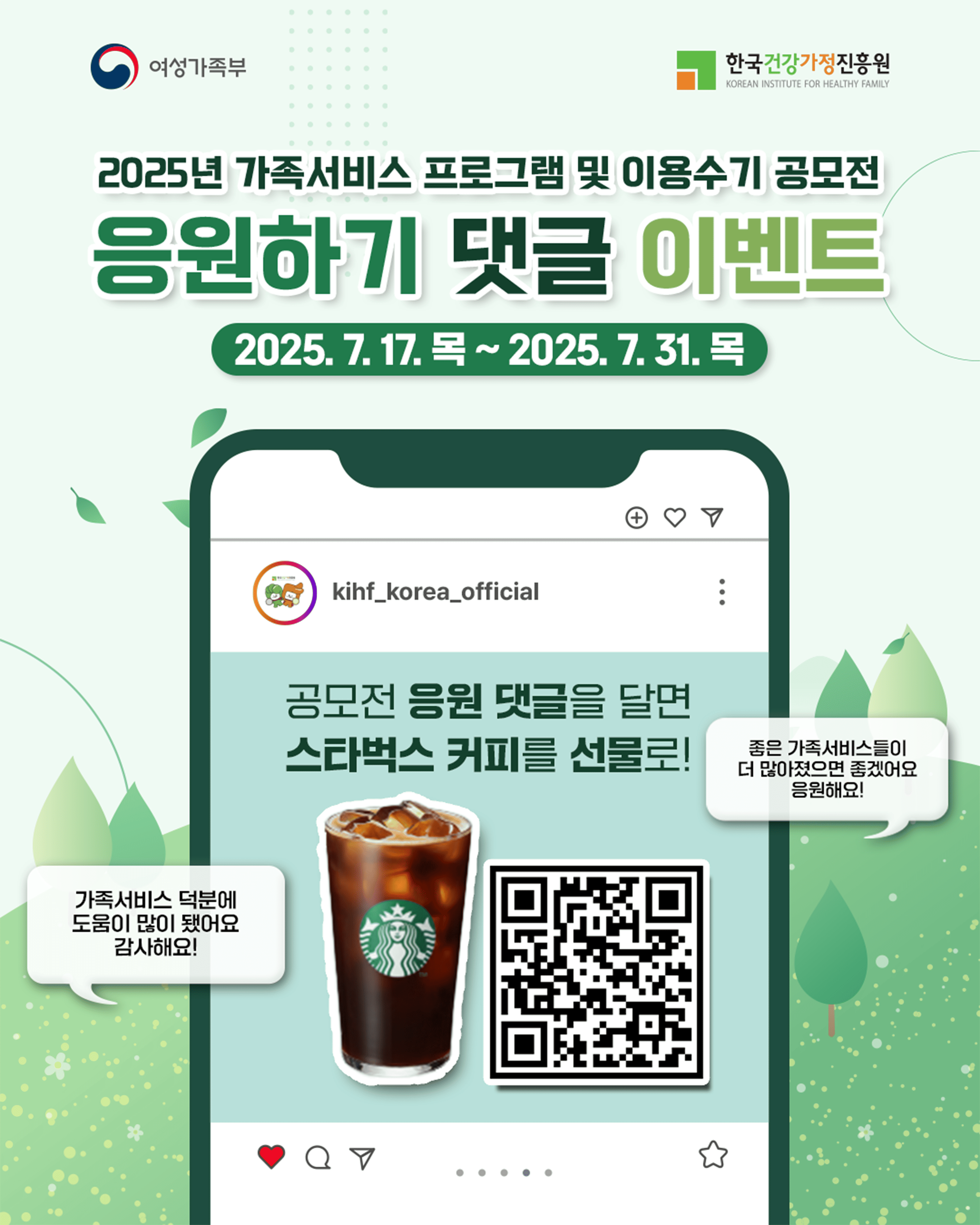 ํ๊ตญ๊ฑด๊ฐ๊ฐ์ ์งํฅ์์์ ์งํํ๋ '2025๋ ๊ฐ์กฑ์๋น์ค ํ๋ก๊ทธ๋จ ๋ฐ ์ด์ฉ ์๊ธฐ ๊ณต๋ชจ์ '์ ์์ํ๋ ๋๊ธ์ ๋จ๊ฒจ์ฃผ์ธ์!
