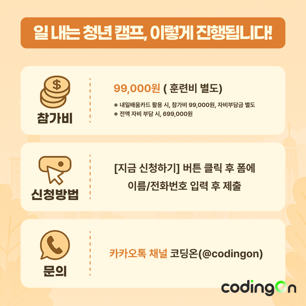 참가비 | 내일배움카드 사용 시 99,000원 (훈련비 자비부담금 별도) |