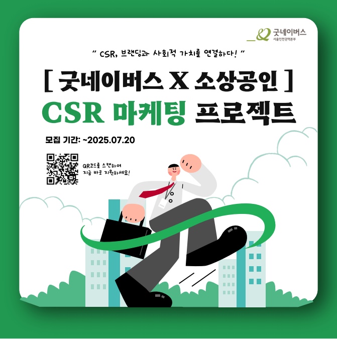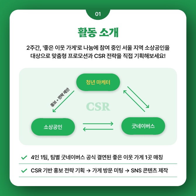 : 굿네이버스 서울인천권역본부와 지역 소상공인들의 협력·주관 하에 진행되는 "CSR 마케팅 프로젝트"는, 굿네이버스와 결연을 맺고 사회공헌 활동에 참여 중인 서울 지역 소상공인 가게를 대상으로, 청년들이 직접 홍보 전략을 기획하고 실행해보는 2주간의 마케팅 프로젝트입니다.