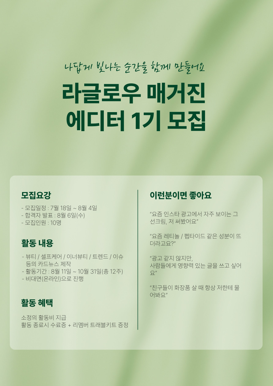 라글로우는 ‘나답게 빛나는 순간’을 위한 뷰티 큐레이션 팀입니다.