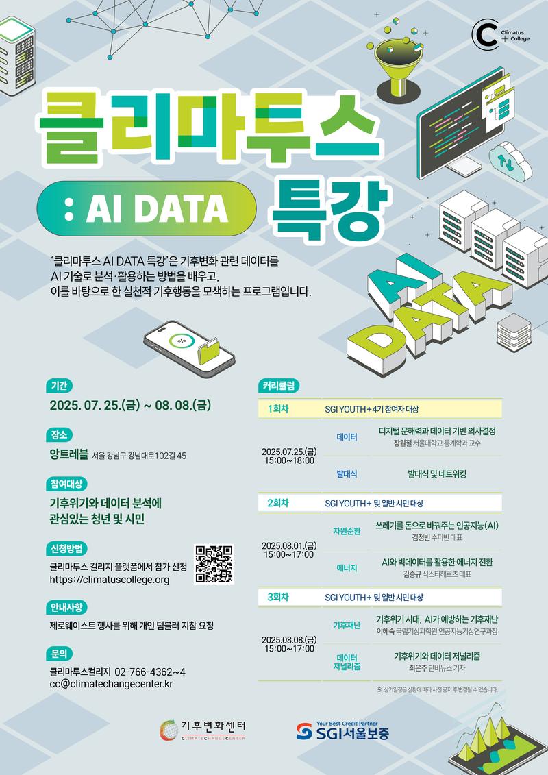「2025 클리마투스 AI Data 특강」은 기후변화 관련 데이터를 AI 기술로 분석·활용하는 방법을 배우고, 이를 바탕으로 실천적 기후행동을 모색하는 프로그램입니다.