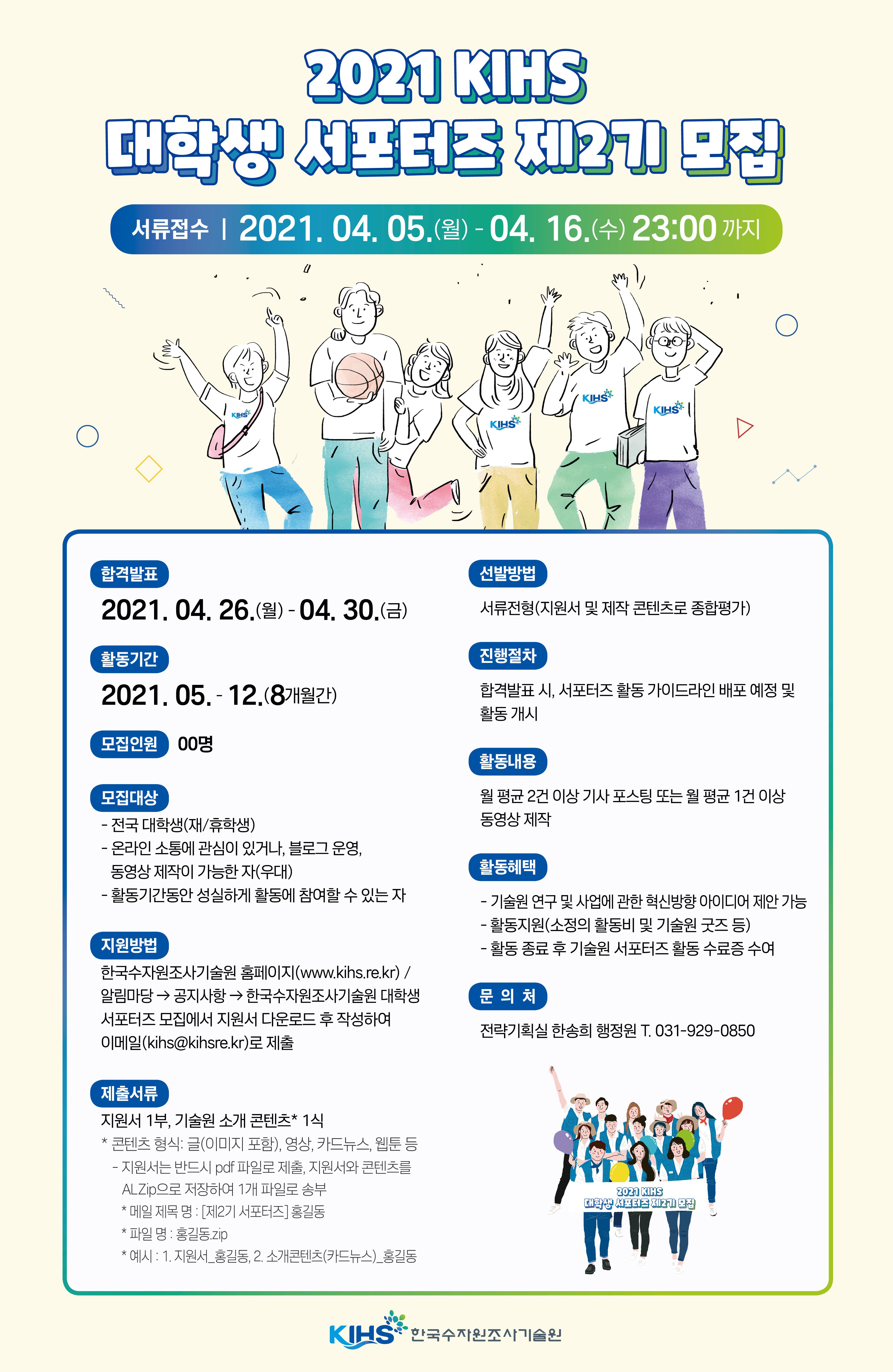- 한국수자원조사기술원 홈페이지(www.kihs.re.kr) / 알림마당 → 공지사항 → 한국수자원조사기술원 대학생 서포터즈 모집에서 지원서 다운로드 후 작성