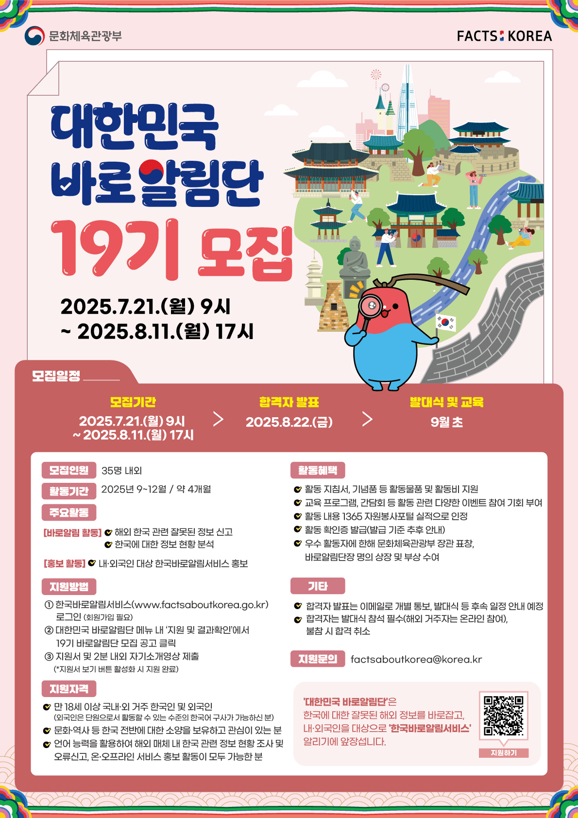 - 언어 능력을 활용하여 해외 매체 내 한국 관련 정보 현황 조사 및 오류신고, 바로알림서비스 홍보(온·오프라인) 활동이 모두 가능한 자