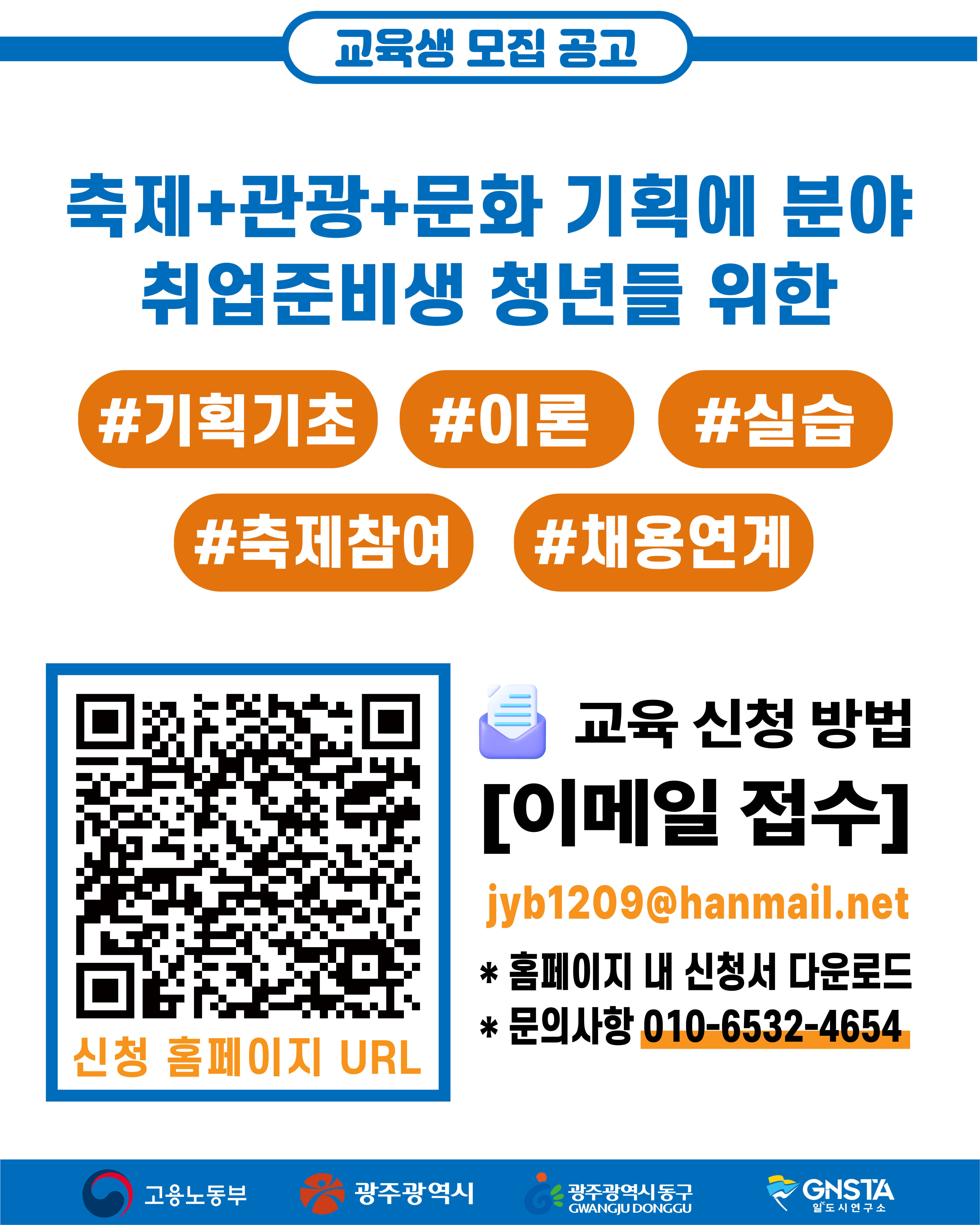 축제 및 예술관광 취업을 원하시는 취준생 여러분들에 많은 관심과 신청 바랍니다.