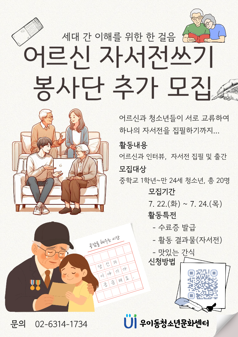 우이동청소년문화센터 어르신 자서전 쓰기 봉사단 추가모집(모집 연장)