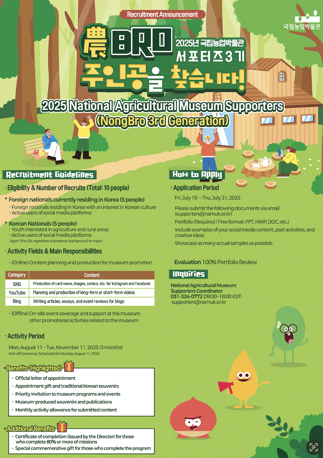 The National Agricultural Museum is recruiting a group of dynamic supporters (NongBro 3rdGeneration) to help promote the museum through engaging online and offline activities. Wewelcome both Korean and international participants who are passionate about agriculture, ruralculture, and creative content.