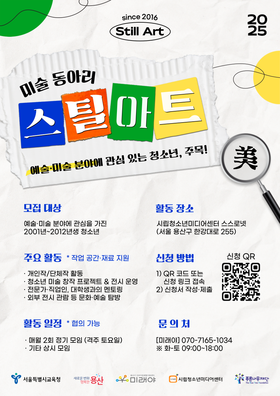 - 미술 분야에 관심을 가진 청소년(2001년~2012년생)이 모여 작품 창작 및 전시 기획 등 다양한 미술 진로 활동을 이어 나가고자 창립된 동아리입니다.