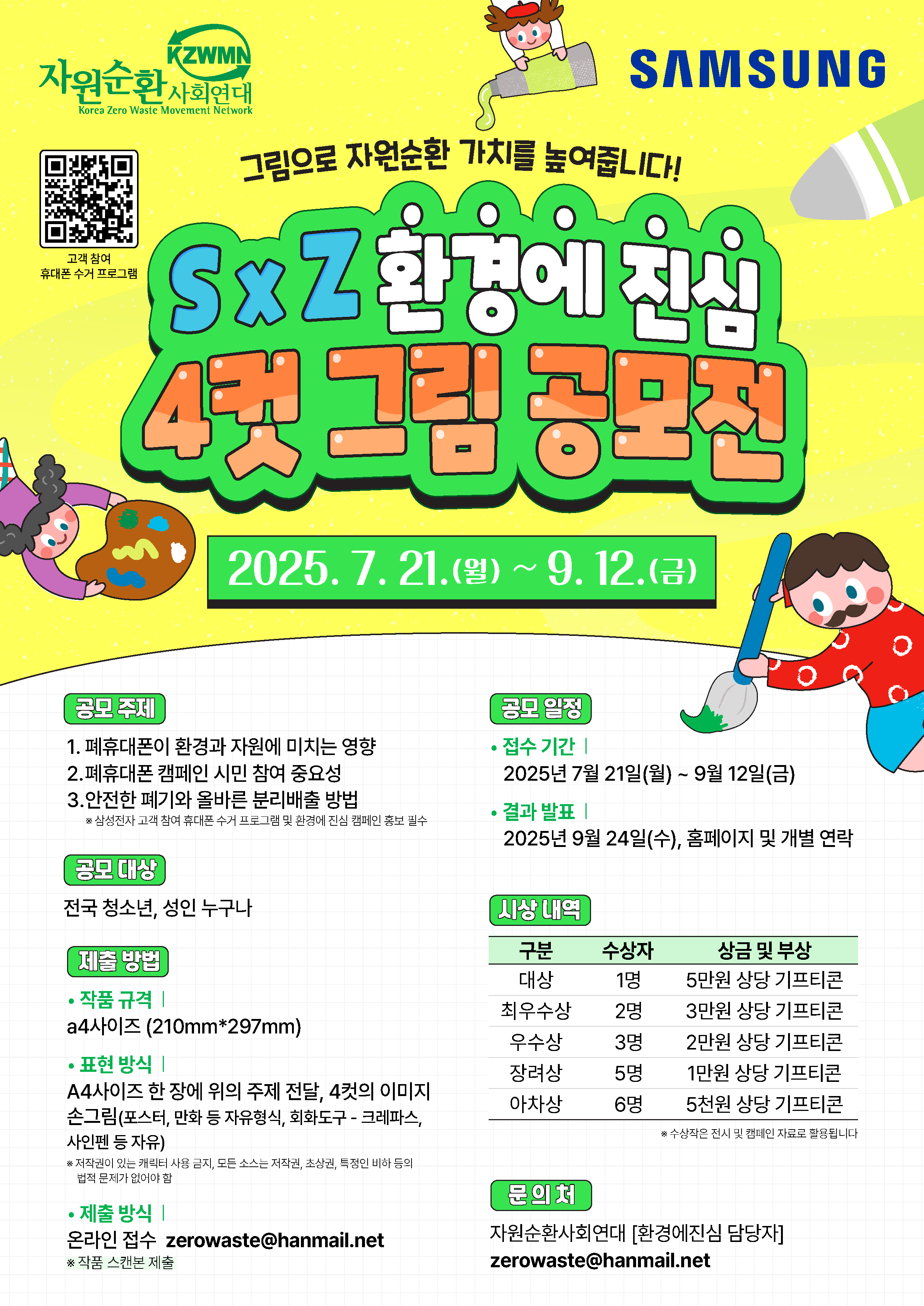 ● 공모 주제 : 1) 폐휴대폰이 환경과 자원에 미치는 영향 2)폐휴대폰 캠페인 시민 참여 중요성 3) 폐휴대폰 안전한 폐기와 올바른 분리배출 방법 * 삼성전자 고객참여 휴대폰 수거 프로그램 및 환경에 진심 캠페인 홍보 필수