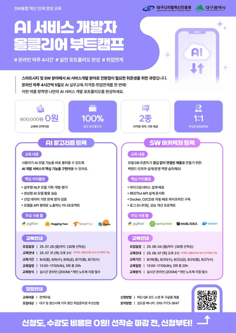 ▶교육 내용 : AI 개발 서비스, SW 구조 설계에 대한 실무 교육부터 취업 지원까지 제공합니다.