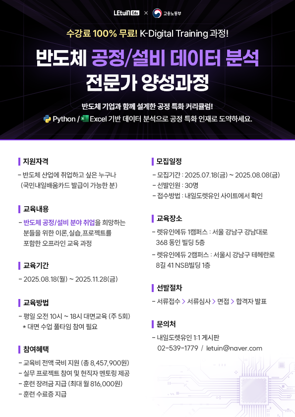 [K-Digital Training] 렛유인에듀X고용노동부 반도체 공정 특화 데이터 분석 전문가 양성 과정