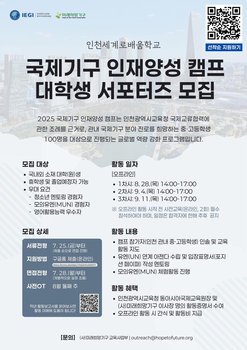 인천세계로배움학교 2025 국제기구 인재양성 캠프 대학(원)생 서포터즈 모집
