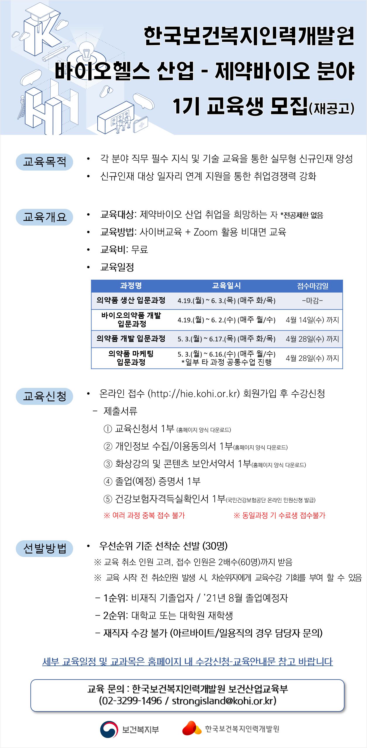 제약바이오산업 분야 취업준비생들을 위한 직무 교육과정 교육생을 모집합니다!