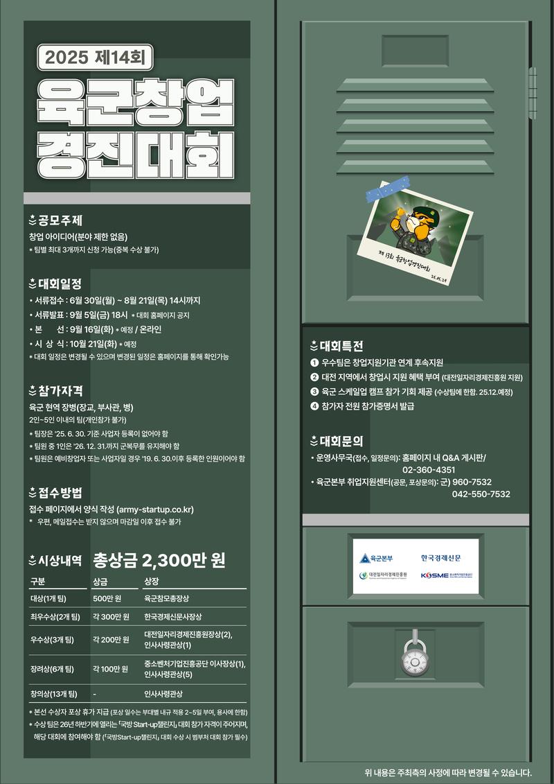 ‘25년 제 14회 육군창업경진대회’를 개최하오니 많은 장병들의 참여를 바랍니다.