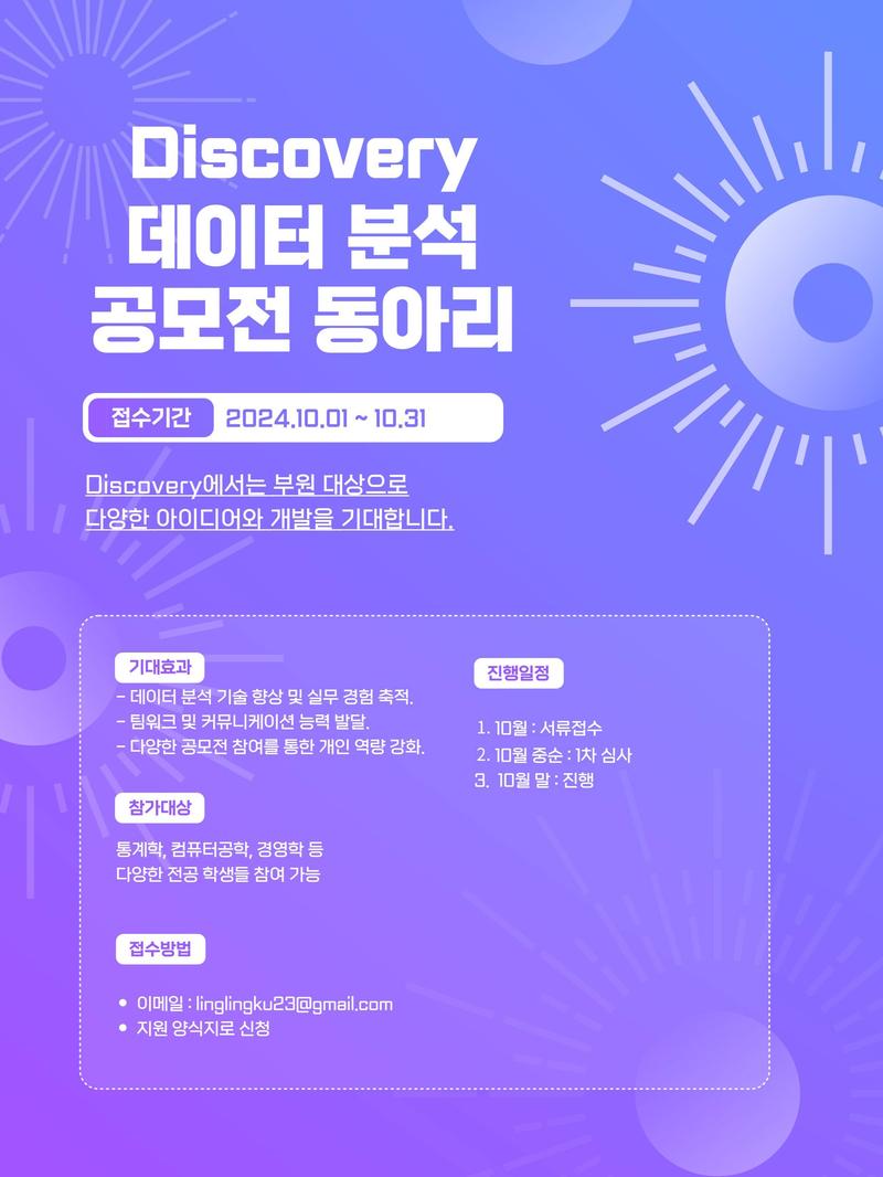 - 데이터 분석 기술 습득: 최신 데이터 분석 기법을 배우고 실습하여 공모전에 참여합니다!