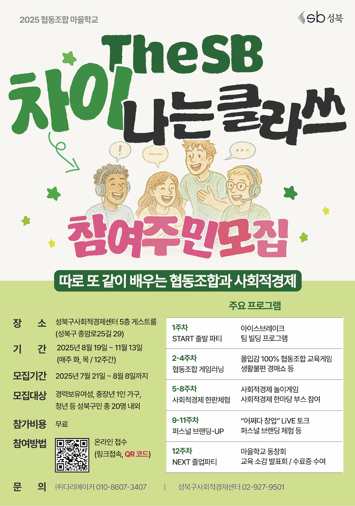 성북구를 무대로 “협동조합과 사회적경제”를 배우고 체험해보는 12주 팀 프로젝트형 학교입니다.