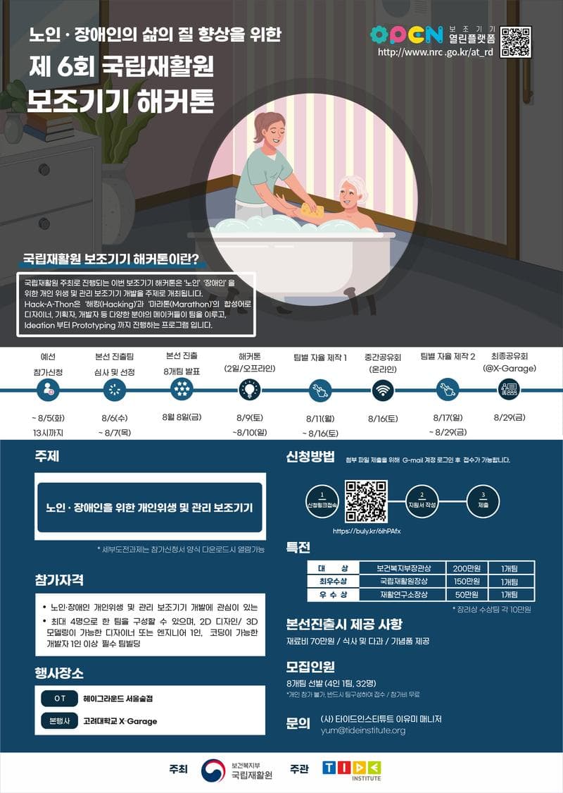 국립재활원 주최로 진행되는 이번 제 6회 국립재활원 보조기기 해커톤은 "노인•장애인을 위한 개인 위생 및 관리 보조기기 개발"을 주제로 개최됩니다.