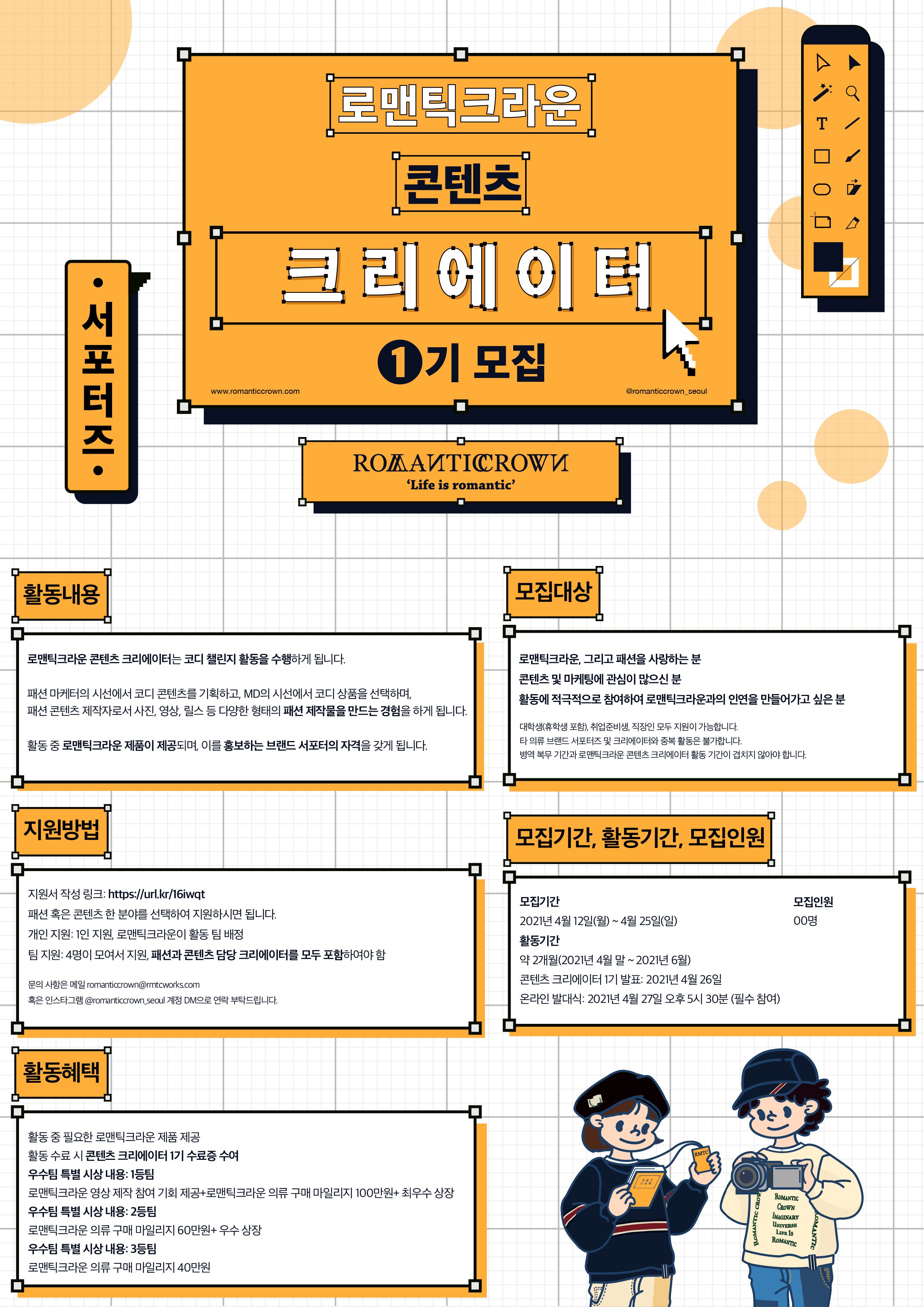 - 활동 중 로맨틱크라운 제품이 제공되며, 이를 홍보하는 브랜드 서포터의 자격을 갖게 됩니다.