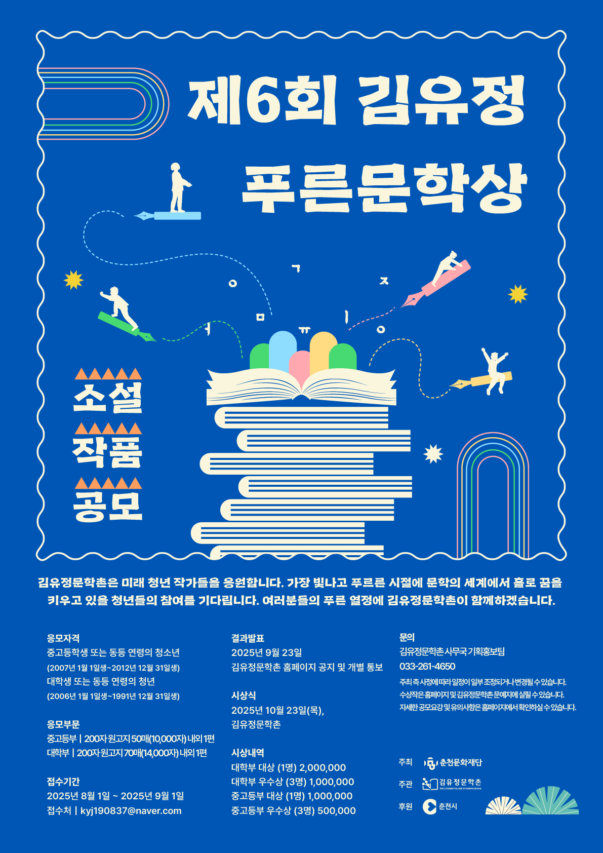 김유정문학촌은 미래 청년작가들을 응원합니다. 가장 빛나고 푸르른 시절에 문학의 세계에서 홀로 꿈을 키우고 있을 청년들의 참여를 기다립니다. 여러분들의 푸른 열정에 김유정문학촌이 함께하겠습니다.