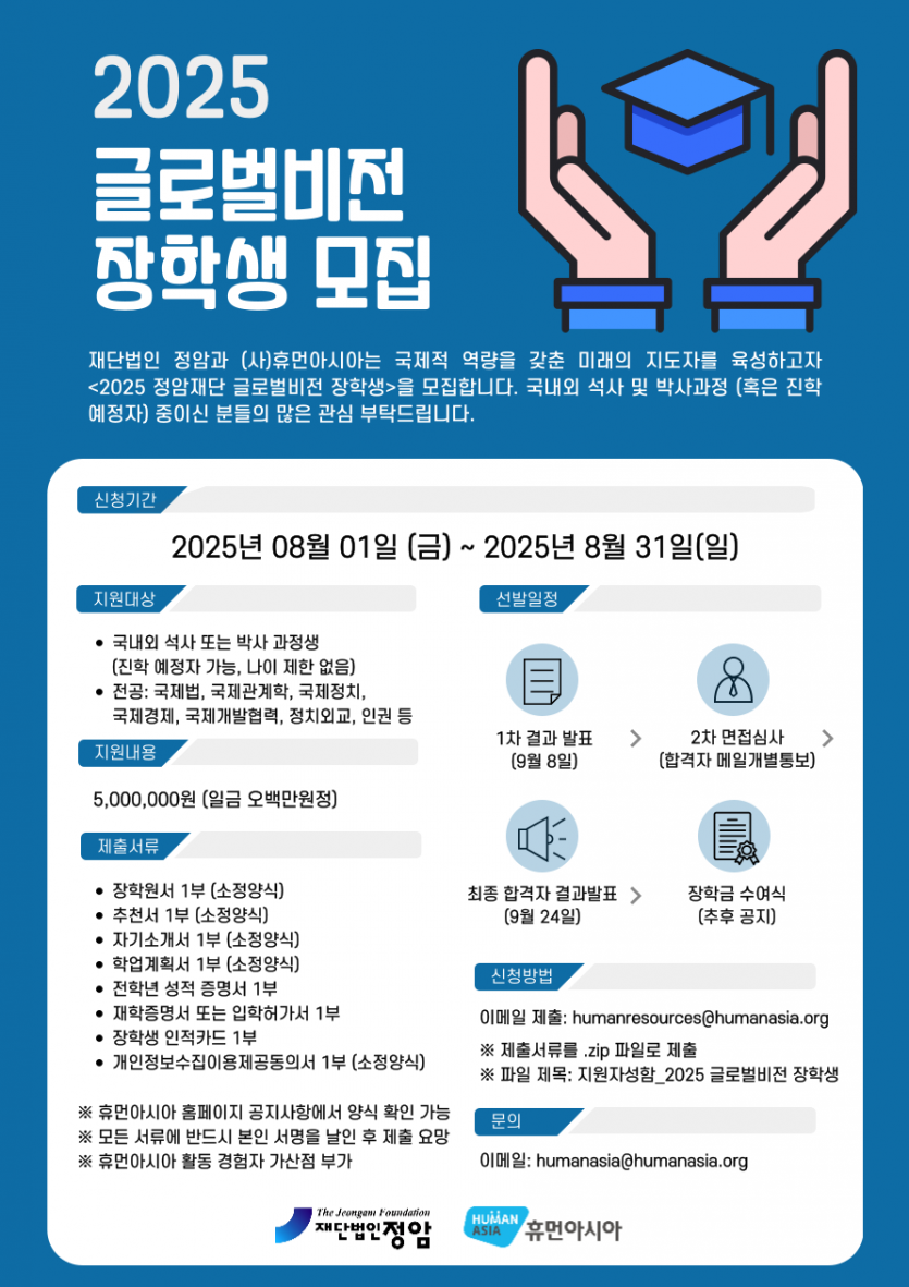 재단법인 정암과 (사)휴먼아시아는 국제적 역량을 갖춘 미래의 지도자를 육성하고자 전문성이 뛰어난 국내·외 석사 및 박사 과정 중(혹은 진학 예정자)인 학생들을 선발, 돕기 위하여 <2025 정암재단 글로벌비전 장학생>을 모집합니다.