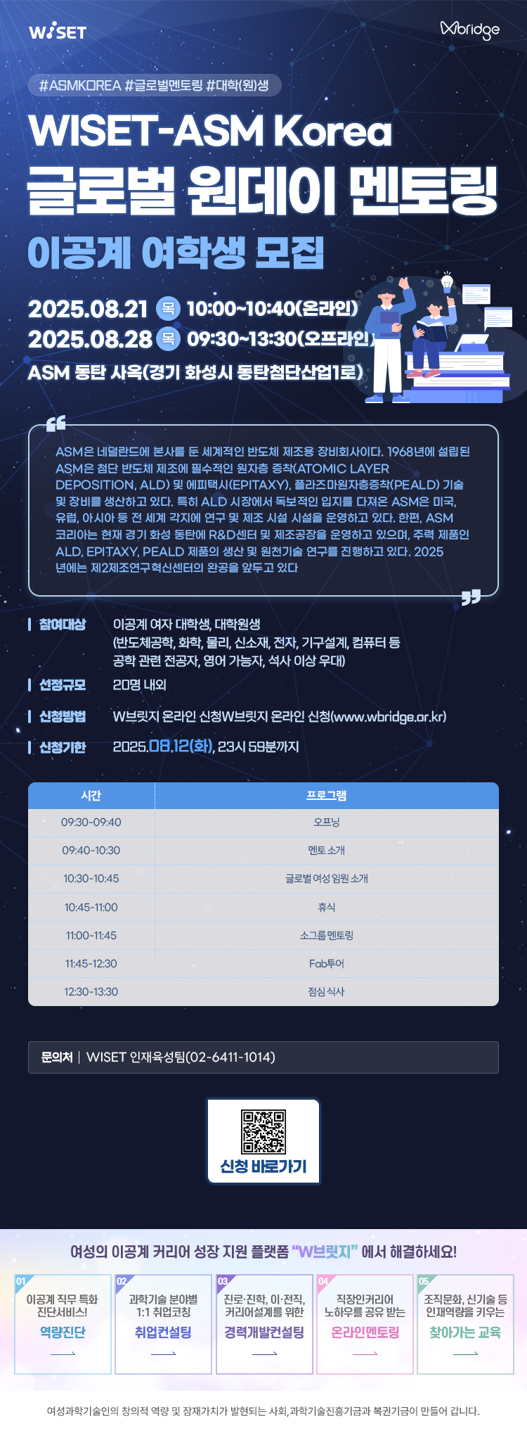 ▶ W브릿지 > 네트워크 > 글로벌 멘토링 > 멘토링 목록 내 「2025년 WISET-ASM 글로벌 멘토링」 신청