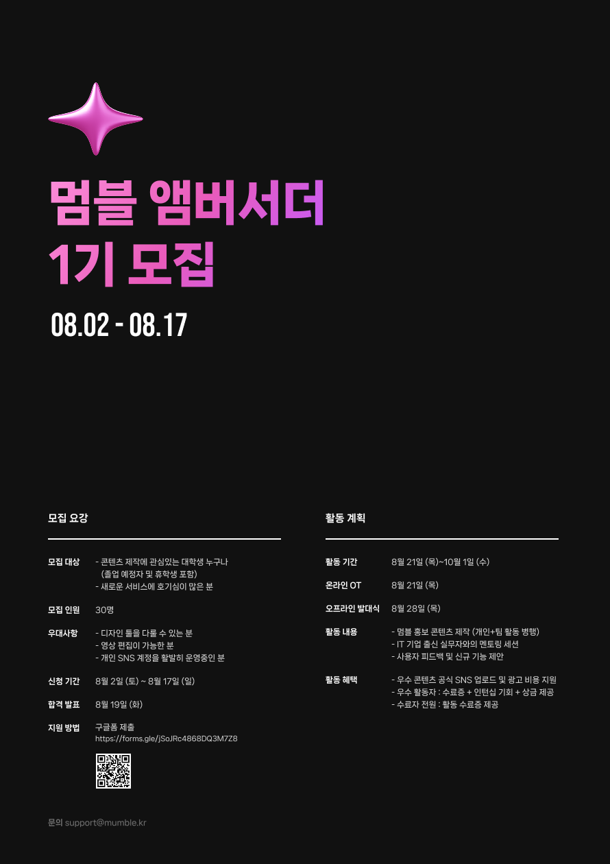 멈블의 기능과 가치를 함께 알리고, 더 나은 방향으로 만들어갈 앰배서더 1기를 모집합니다.