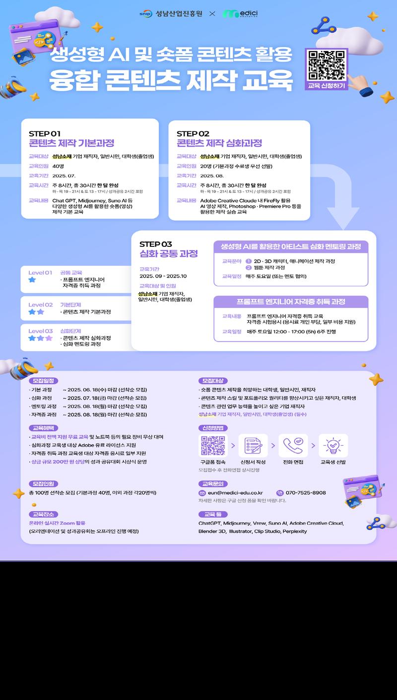 성남산업진흥원에서 주관하는 2025년 생성형 AI 활용 융합콘텐츠 제작 교육과정으로 폼 콘텐츠 제작과 생성형 AI 활용에 관심있다면 성남 시민 누구나 참여 가능하며 100% 무료로 교육이 진행됩니다. (단, 자격증 비용은 별도)