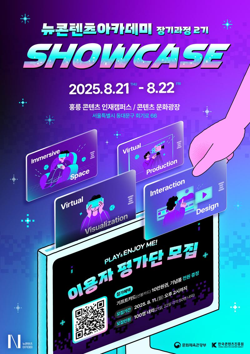 여러분이 직접 콘텐츠를 체험하고, 피드백을 전달하는 뉴콘텐츠아카데미 장기과정 2기 쇼케이스 이용자 평가단을 아래과 같이 모집합니다.