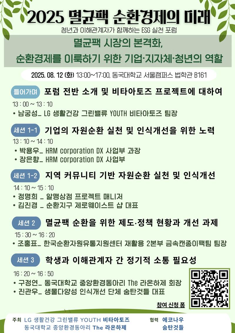 포럼을 통해 멸균팩 산업 확장에 대비해 우리 사회 구성원들의 역할을 재정립하고 관련 주제들에 대해 견해를 다각적으로 공유하는 시간을 가지고자 합니다. 세션에서 나오는 의견들을 수합해 동국대학교 ESG 위원회에 전달 예정이니 자원순환에 관심 있으신 분들의 많은 참여 부탁드리겠습니다!