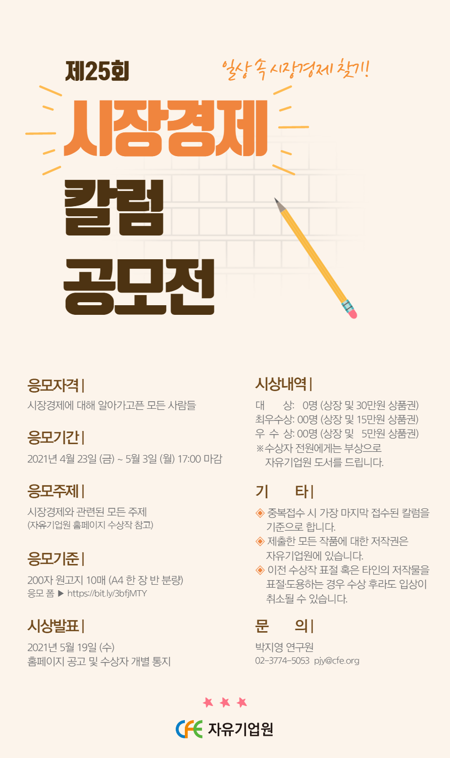 자유기업원이 제25회 시장경제칼럼 공모전을 개최합니다. 시장경제의 눈으로 바라보는 우리의 일상, 여러분의 다양한 생각을 기다립니다!