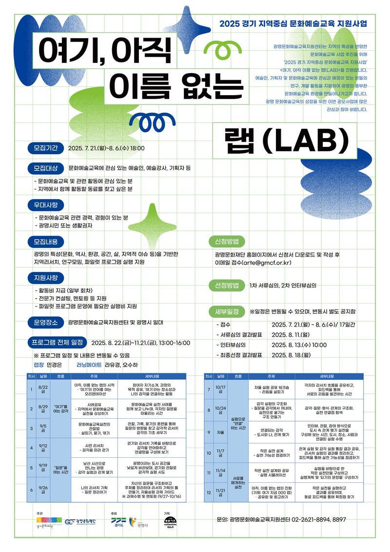 [광명문화재단]2025 경기 지역중심 문화예술교육 지원사업 '여기, 아직 이름 없는 랩(LAB)' 참여자 모집 공고